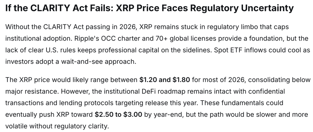 If the CLARITY Act does not materialize, the XRP will most likely stay stuck in a regulatory gray area, with the price action ranging widely. Having the OCC charter and over 70 licenses worldwide gives Ripple a strong foundation, but the lack of clear US rules is causing a lack of entry by institutional investors. As we move towards the year 2026, the XRP will most likely stay trading between the ranges of around $1.20 and $1.80.