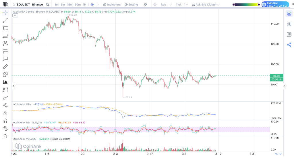 The 4-hour chart shows the Solana price at $88.75, consolidating near key levels after bouncing from $72. Resistance sits at $94, with a break above potentially triggering a rally.