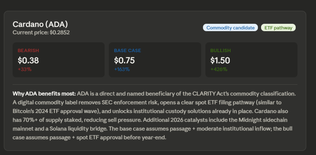 Claude AI predicts that the Cardano price could see notable upside if the Clarity Act becomes law because ADA is often considered a strong candidate for classification as a digital commodity under the proposed framework.