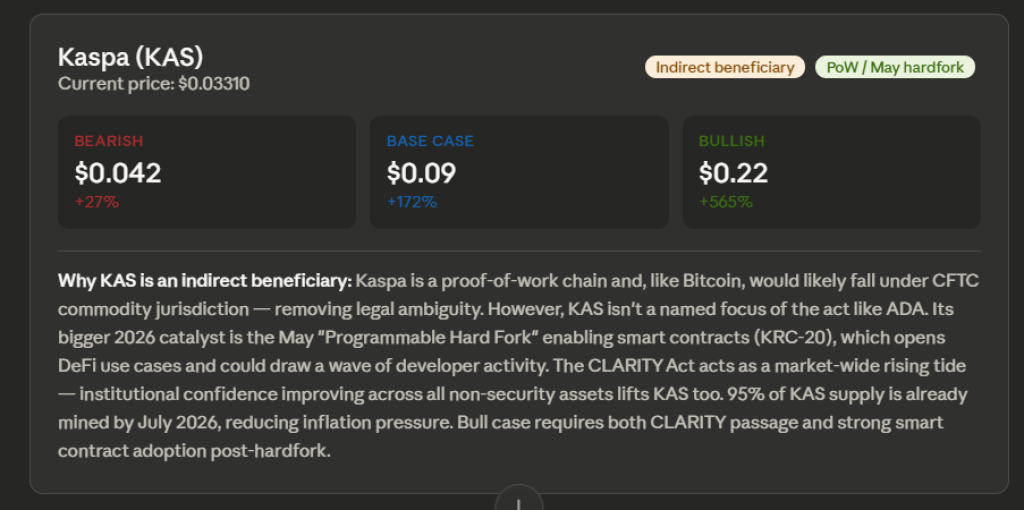 The Clarity Act, combined with this upgrade, could provide a rising tide that lifts KAS along with other non-security digital assets.