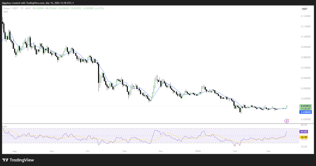 The chart for Kaspa shows a similar pattern of consolidation after a steep correction from earlier highs.  was trading at $0.03301, having hit a high of $0.03366 and a low of $0.03081.