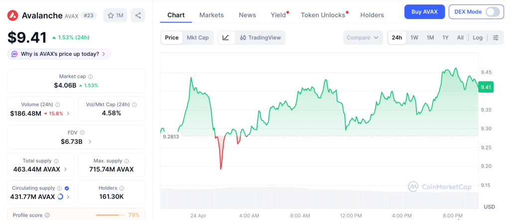Avalanche (AVAX) Price at $9.41 as CME Futures and Three Spot ETFs Build Institutional Demand