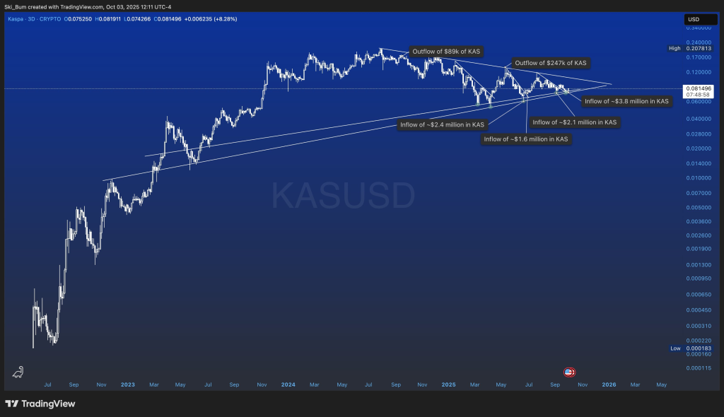 The chart shared by @SkiBumTrading supports that view. It highlights several large inflows over the past months – around $3.8 million, $2.4 million, and $2.1 million worth of KAS – showing strong demand each time the price dipped.