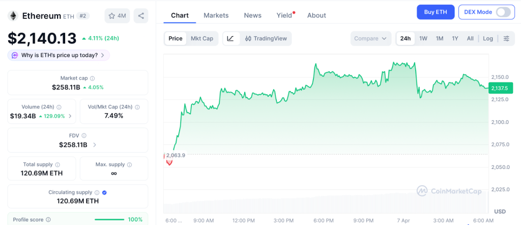 ETH traded at $2,140 on April 7, 2026, recovering 4.11% on ceasefire headlines but still 57% below its all time high near $4,946 according to CoinMarketCap