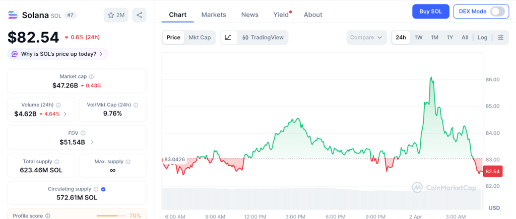 SOL trades near $82.54 according to CoinMarketCap, still more than 60% below its cycle high. The solana price prediction for April targets $100 as key resistance with a breakout opening a path to $120.