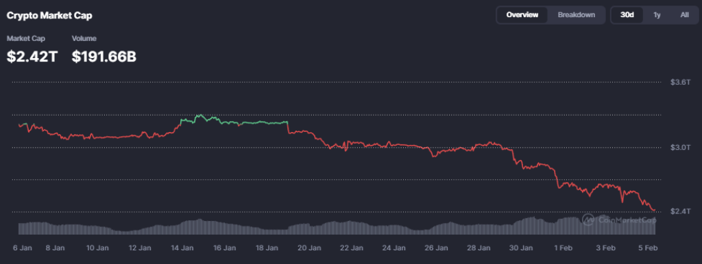 Beyond Bitcoin, the total crypto market cap is now testing a major yearly support zone near $2.42 trillion.