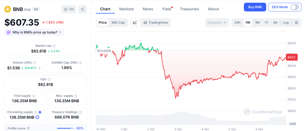 BNB trades at $607 with 56.6% dominance across the Binance ecosystem according to CoinMarketCap