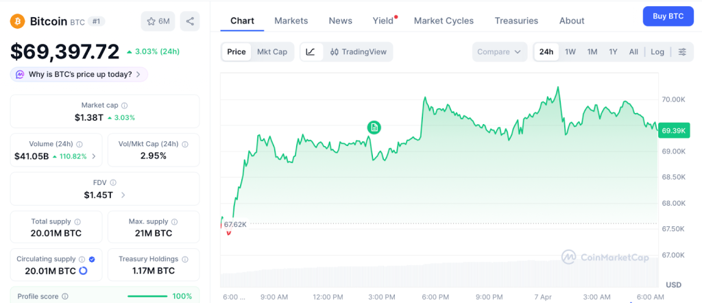 BTC traded near $69,397 on April 7 according to CoinMarketCap, bouncing 3.03% on ceasefire hopes.