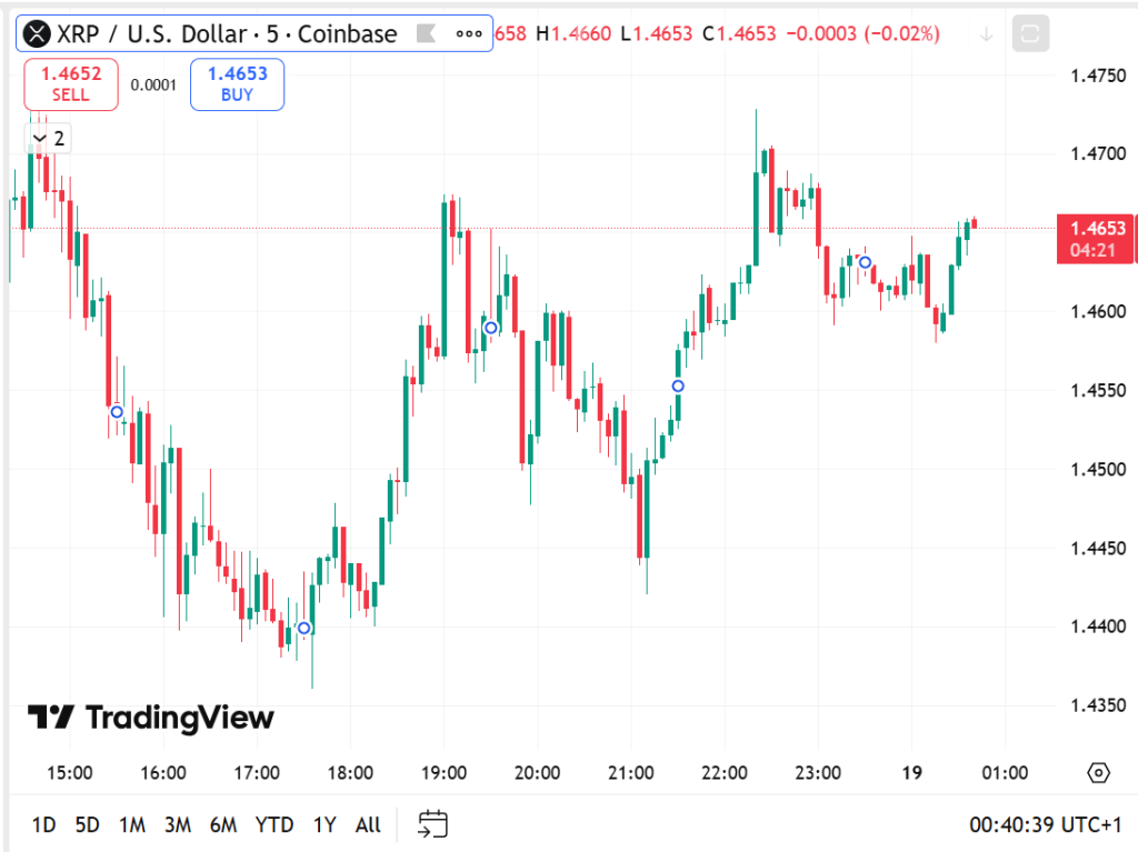 XRP is down 5.29% to $1.46 with a market cap of $89.01 billion and a trading volume of $2.99 billion, down 39.81% on the session. The near-40% volume drop signals that buyers have stepped away entirely rather than actively selling.