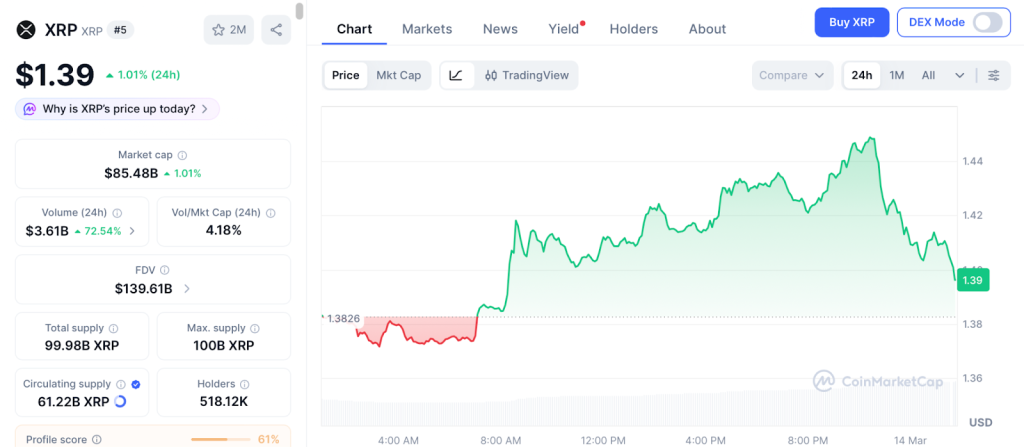 XRP broke above $1.39 this week with volume surging over 300%, ending the early 2026 downtrend. The path to $1.61 is open and $3 is possible if the bull market sustains.