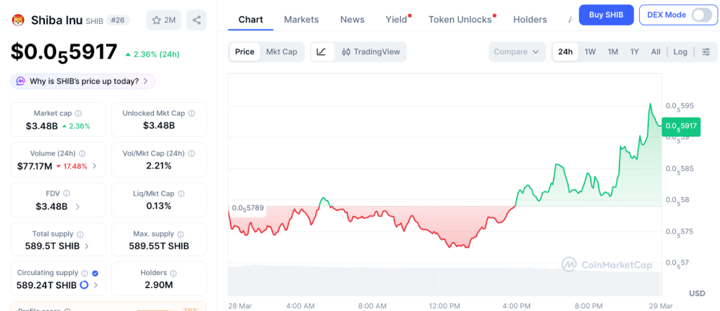 SHIB trades at $0.00000591 per CoinMarketCap, holding steady as Shibarium processes over 1 billion transactions.