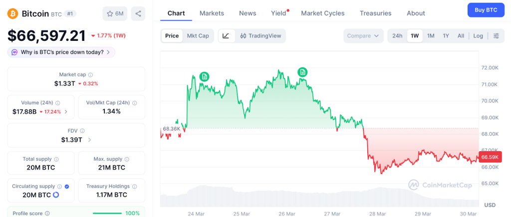 Bitcoin trades near $66,597 after dropping 1.77% this week according to CoinMarketCap, with $171 million in ETF outflows on Thursday.