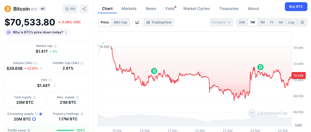 Bitcoin trades near $70,533 as of March 24 after recovering from $68,000 following Trump postponing the Iran strike, with Strategy holding 762,099 BTC and spot ETFs posting four straight weeks of inflows totaling $2 billion, according to CoinMarketCap