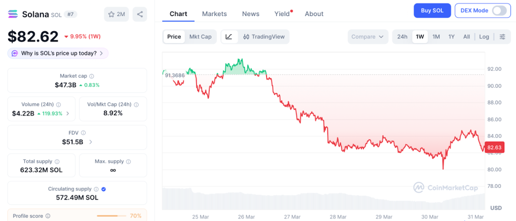 Solana traded at $82.62 on March 30, according to CoinMarketCap. The network processed more transactions than Ethereum in March, but the token remains 72% below its November 2025 peak.