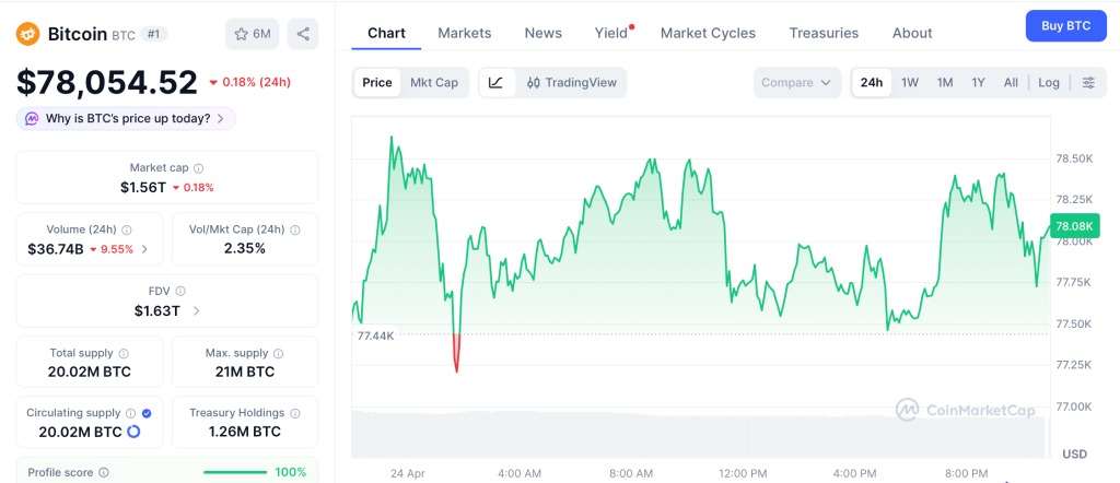 Bitcoin (BTC) prints $78,054 after clearing $79,000 on April 22 per CoinMarketCap, the first breach of that level since February, with support holding near $75,527 at Strategy’s cost basis while resistance at $82,000 needs to clear for a push toward $88,000.