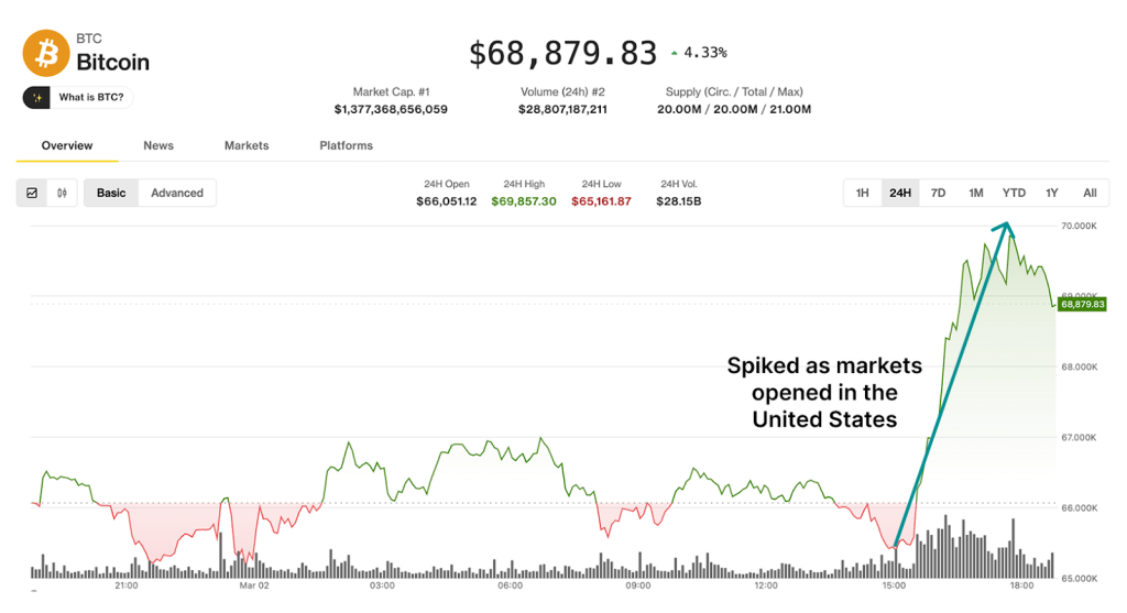 Bitcoin soars to almost $69,000 as trading begins in the US