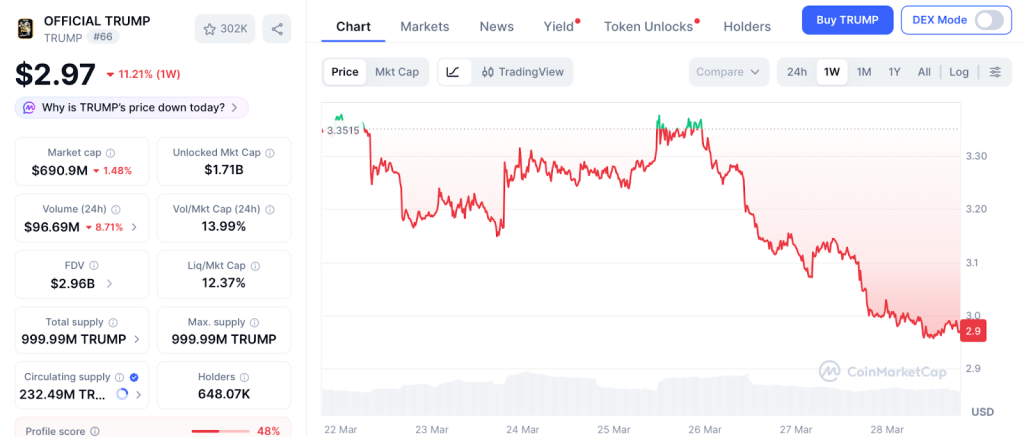 A $23 million transfer from a team wallet shook the TRUMP market on March 26, dropping the token 11% to $2.97 support according to CoinMarketCap.