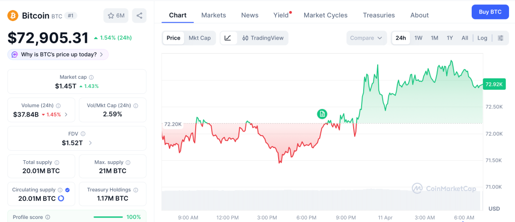 Bitcoin (BTC) trades at $72,905 on April 11 with a $1.45 trillion market cap, down 42% from its $126,272 all-time high, according to CoinMarketCap.