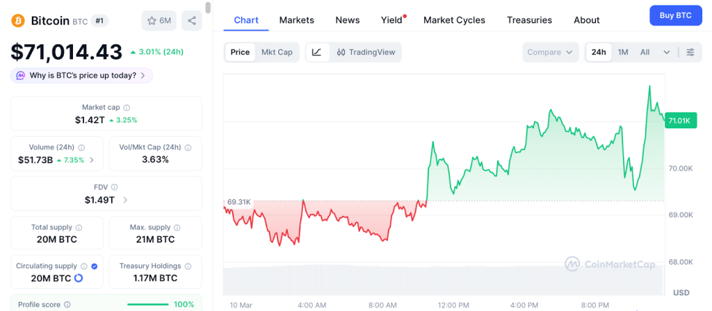 Bitcoin reclaimed $71,000 according to CoinMarketCap after VanEck’s CEO called a cycle bottom and Trump signaled resolution in Iran, according to CoinDesk.