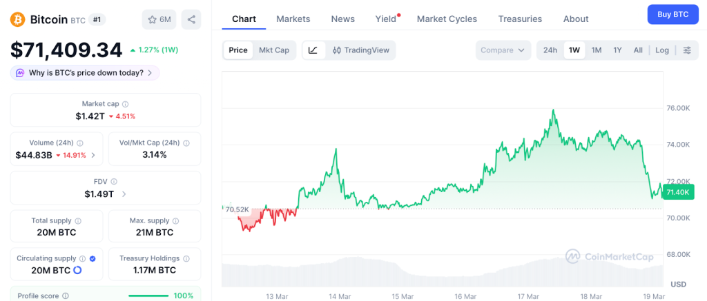 Fortune reported that Bitcoin was at $73,717 on March 17 while Ethereum held near $2,317.  And now on 18 March Bitcoin is trading around $71,409  and Ethereum is trading around $2,192 according to CoinMarketCap.The Federal Reserve rate decision on March 18 could shape the crypto news today outlook for Q2.