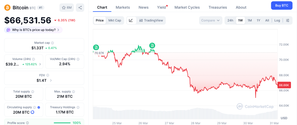 BTC trades at $66,531 per CoinMarketCap, with Bernstein targeting $150,000 and calling the bottom. March ETF inflows remain $1.36 billion positive.