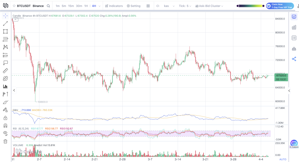 We had a look at the Bitcoin chart, and the timing couldn’t be more interesting. After bouncing back hard from the February crash, BTC tried to push higher but couldn’t clear $76,000. That failure to break through left a lower high on the chart, and since then, price has just been drifting sideways, stuck in the $67,000 to $68,000 range.