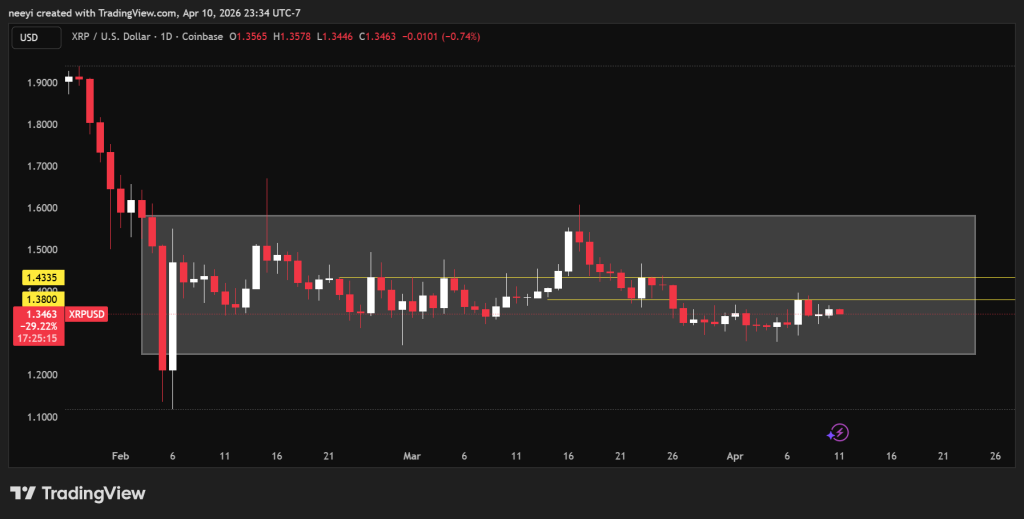 XRP price has been consolidating since early February, and that pattern still defines its current behavior. Price has remained mostly between $1.30 and $1.50, and nothing in the latest structure suggests a sudden move outside that range today.