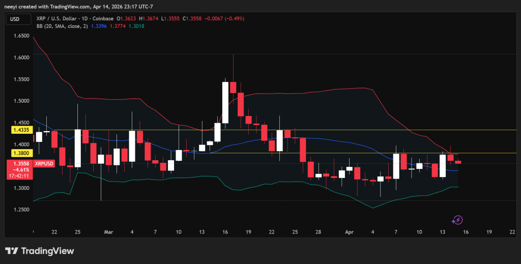 A move toward $1.33 now looks likely as price drifts toward the middle Bollinger band. A break below that zone could extend the move to $1.30, which aligns with the lower band. That range between $1.30 and $1.38 continues to define XRP structure for now.