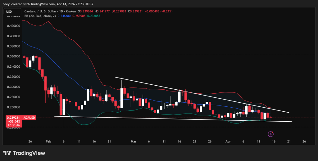 The broader pattern resembles a falling wedge, which often precedes a breakout. The upper boundary of that wedge sits near $0.26, and that level also aligns with the upper Bollinger band. A break above $0.26 would change sentiment quickly. Until then, the market likely stays in consolidation with a slight bearish tilt.