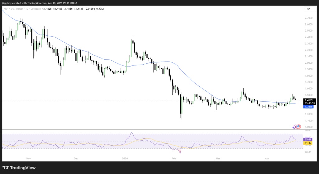 Current momentum points toward a continued retest of $1.38 support. A bounce from that level could push XRP back toward $1.45–1.48. A failure around $1.38 would probably indicate further weakness toward $1.33.