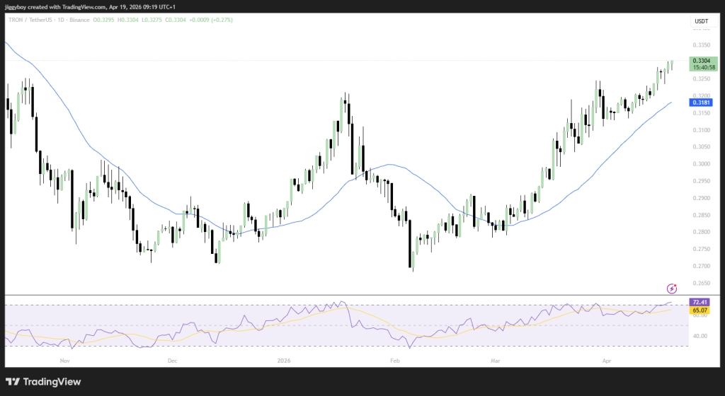 Looking at the chart, the TRX price has been grinding higher since the start of April. Price is now trading near $0.3300, with resistance at $0.3400–0.3450. Support sits at $0.3275 and then $0.3200.