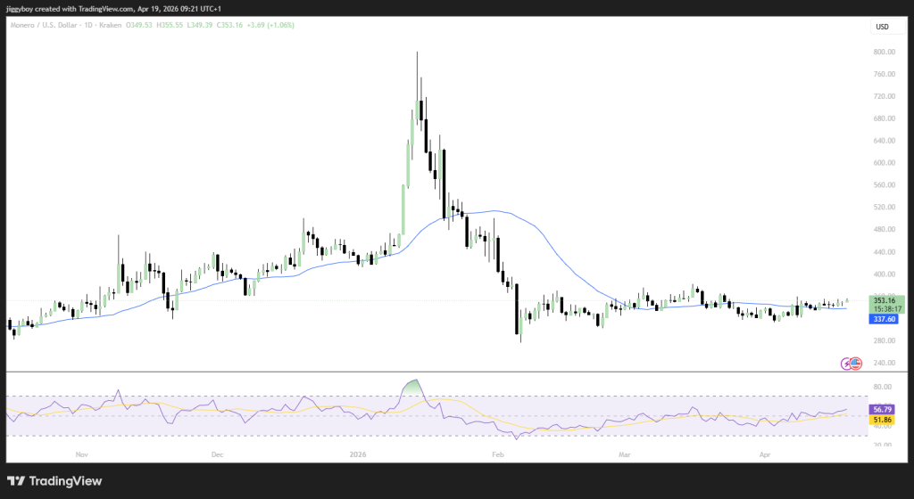 We took a look at the chart and Monero has broken above the $337.60 level that acted as resistance in March. Price now sits at $353.16, with the next resistance zone at $400–440. Support has moved up to $337.60, and further support sits at $280.