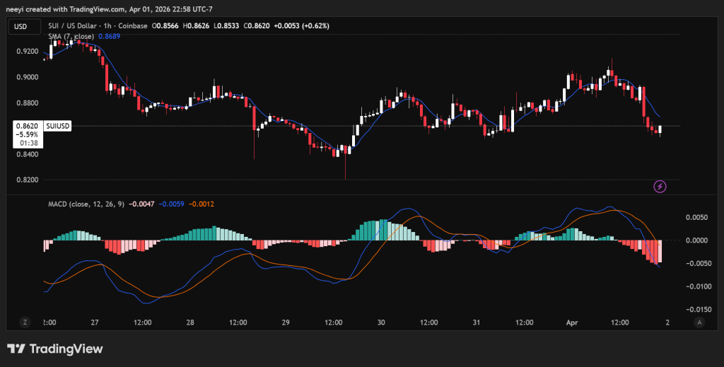 SUI has spent the last 30 days moving through a fairly contained range, though the direction inside that range has leaned lower. The coin pushed up from just above $0.90 in early March and reached a swing high near $1.07 around March 16, but that move did not last. Price gradually gave back the entire climb and dropped toward $0.88 by April 1, with fresh weakness now pressing closer to $0.85.