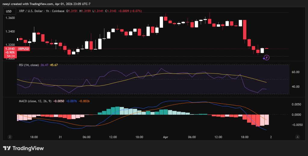 The hourly indicators keep the pressure on. XRP is trading around $1.31, below the 7-period SMA near $1.33 and the 30-period SMA near $1.35.