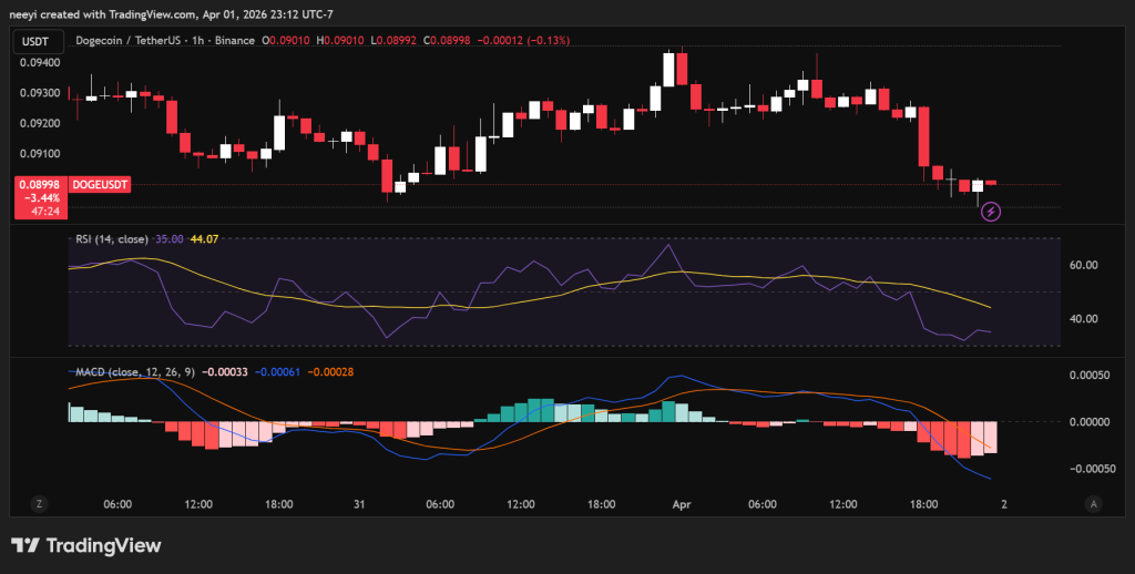 The latest hourly view shows DOGE at $0.089, below the short SMA near $0.091 and the medium SMA near $0.092. RSI 14 is around 34, which shows soft momentum. MACD is slightly negative and below the signal line. That setup points to controlled downside pressure, not a major flush lower.