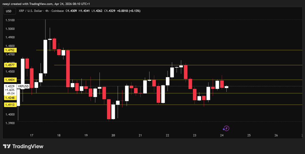 XRP price is trading around $1.43 after gaining about 0.66% over the last 24 hours. The previous session showed a controlled range with no aggressive buying or selling pressure. Price stayed between roughly $1.41 and $1.444, which places the current level near the upper half of that band.