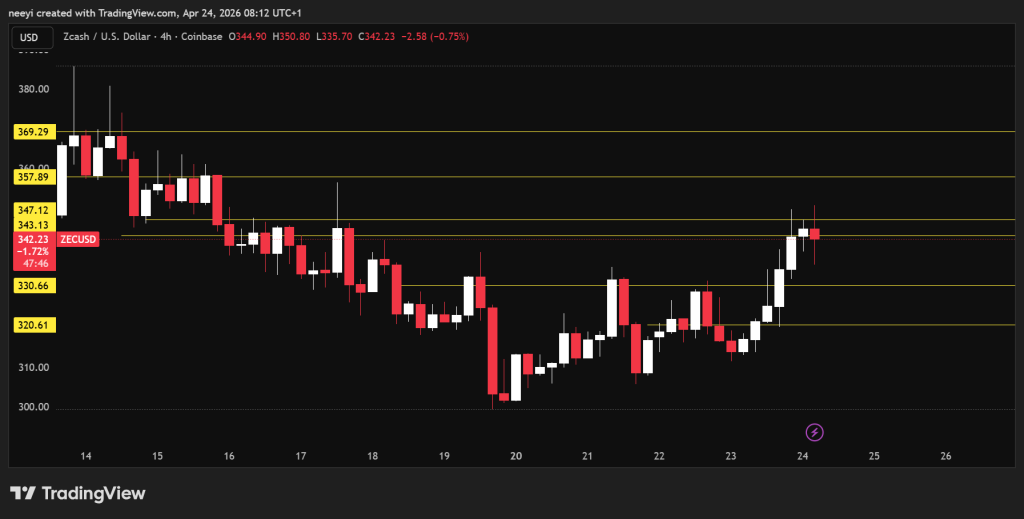 The recent range places the high near $347.78 and the low near $312.56. ZEC Price now sits close to the top of that range, which explains why the move feels stretched.