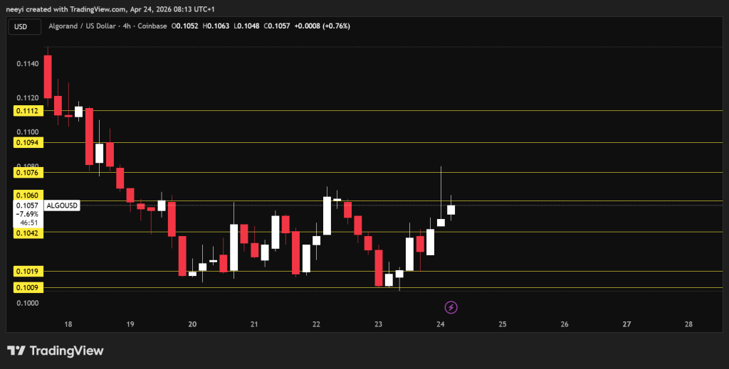 Algorand price trades around $0.1055 after gaining about 3.49% in the last 24 hours. The move has been gradual, with price climbing from around $0.101 into the $0.105 range.