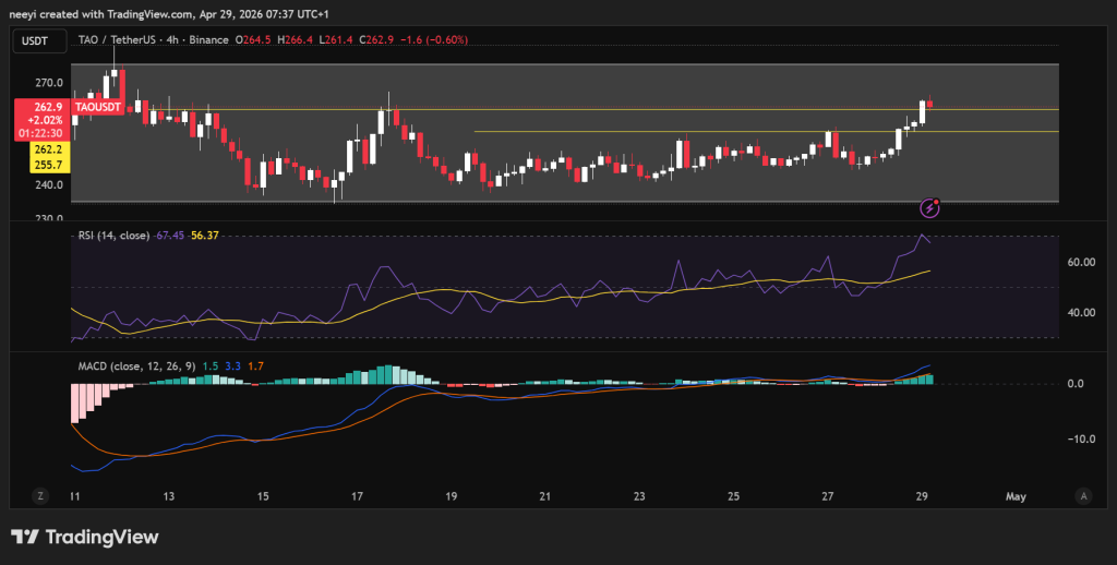 TAO price recently bounced from support near $262 and is now trading around $265. As long as this support holds, a move toward $275 becomes the next likely step within the range.