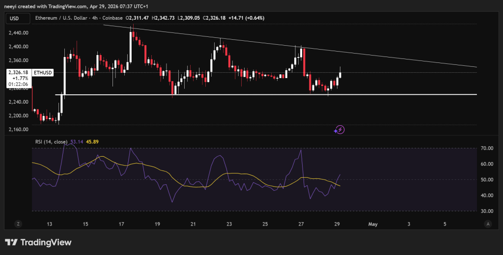 Ethereum price has stayed below a descending trendline since mid-April, and that structure continues to limit upward movement. Price has repeatedly bounced from the $2,250 to $2,270 support zone, and each bounce has sent ETH back toward the same resistance area.