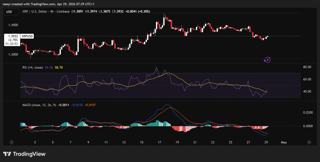 XRP price moved lower in the previous session, with a high near $1.4 and a low close to $1.367. Today’s move shows a recovery attempt, as price pushes upward to retest the broken support level as resistance.