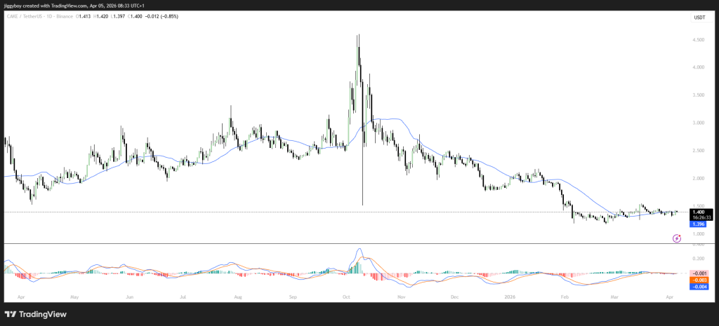 The last 7 days show CAKE stuck in a narrow range between roughly $1.38 and $1.42. Every attempt to push higher has been met with selling, and every dip has found some buying support. That’s the definition of a sideways market.