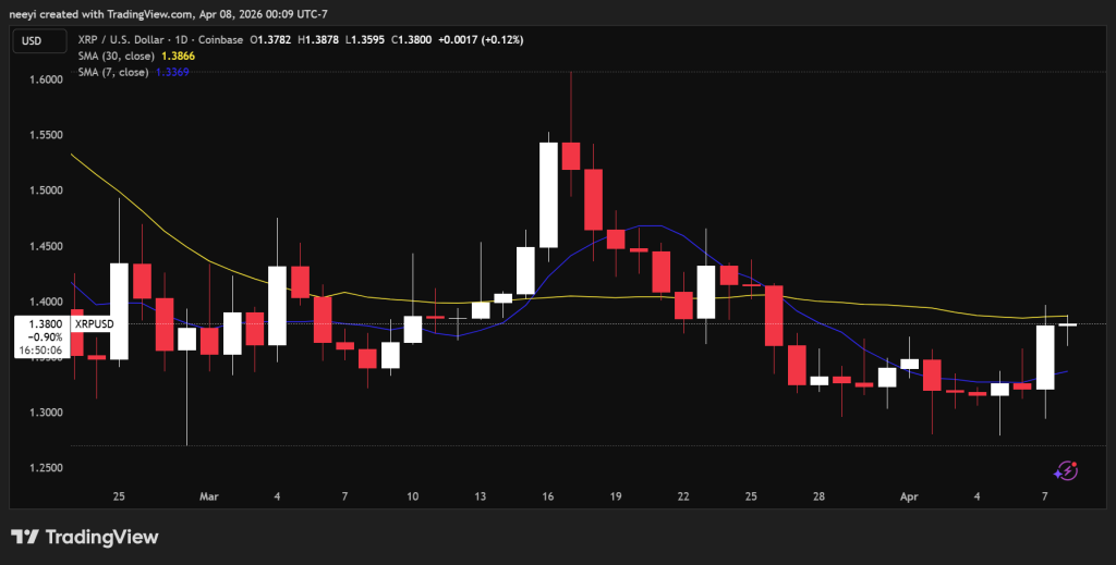 The last 7 days show a bounce from about $1.30 toward the $1.40 area. The past 24 hours also helped the chart, with XRP rising from around $1.31 to $1.38 and posting a 5.72% gain.