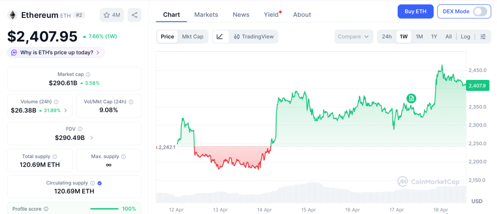 Ethereum (ETH) is printing $2,407 per CoinMarketCap after gaining 0.89% across the session. A push through $2,400 opens $2,600, with $2,100 as the line that decides direction.
