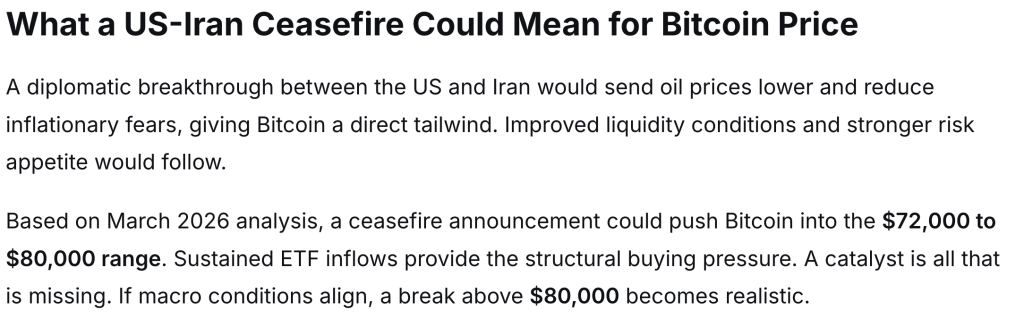 A ceasefire announcement, according to DeepSeek, may propel the price of BTC to the range of $72,000 and $80,000 in the near future. However, if the macro environment remains favorable and the ETF inflows remain constant, the price may rise above $80,000.
