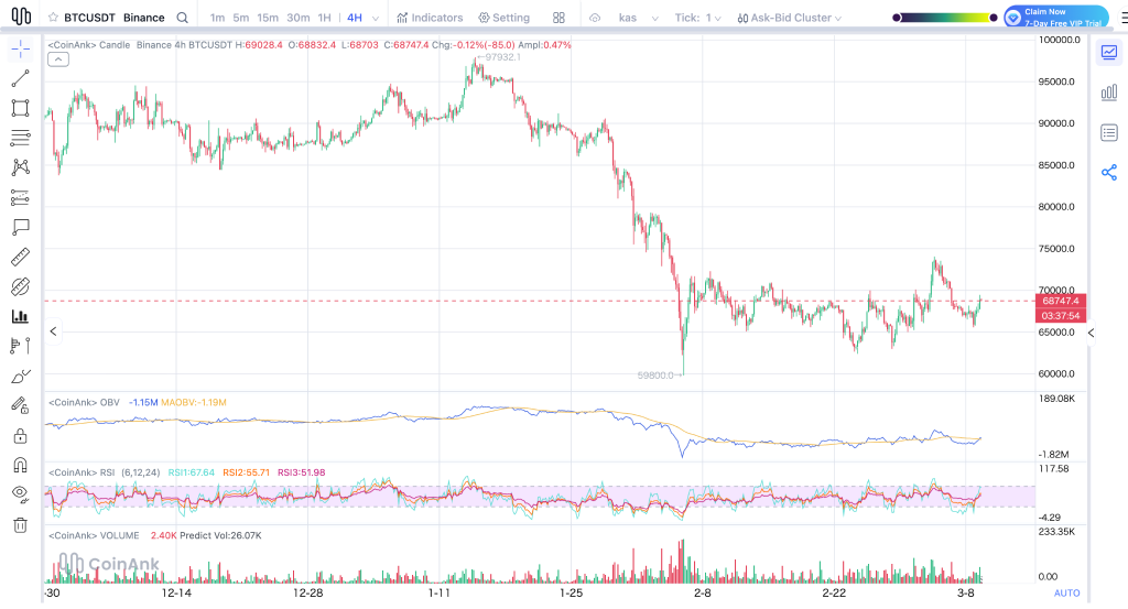 A brief look at the charts will give us a better idea of where Bitcoin is at the moment. We took a look at the 4-hour chart, and Bitcoin is seen changing hands at around $68,747, rallying steadily since the dip in February when the price fell to around $60,000.