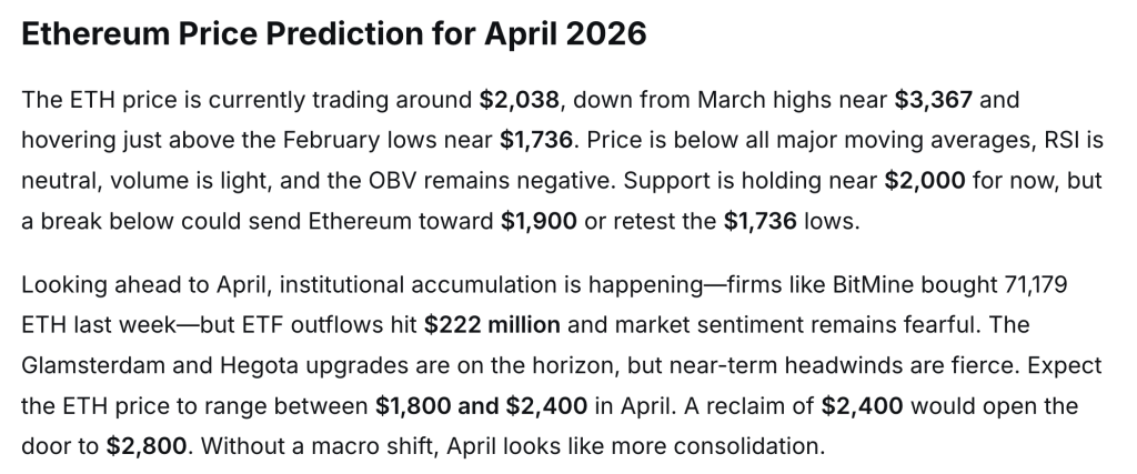For April, the expectation is a range between $1,800 and $2,400. If the ETH price can break back above $2,400, things could start looking more interesting. But if it drops below $2,000, a move toward $1,900, or even back to $1,736, starts to come into play.