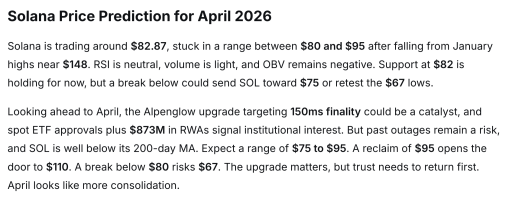 For April, the expected range is between $75 and $95. If the SOL price can break above $95, a move toward $110 could follow. If it drops below $80, though, the $67 level comes back into focus.