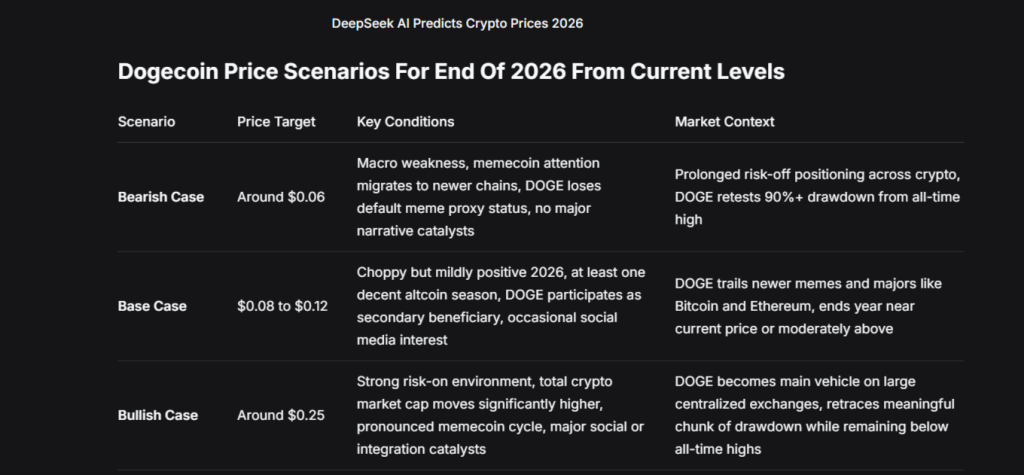 Starting from approximately $0.10, with roughly 12% losses over 30 days, about 42% losses over one year, and an 86% drawdown from all-time highs, DeepSeek AI generated three scenarios.