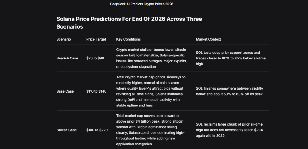 The base case ranges from approximately $110 to $140. Conditions supporting this outcome include total crypto market cap grinding sideways to modestly higher, a normal altcoin season where quality layer-1s attract bids without revisiting all-time highs, and Solana maintaining strong DeFi and memecoin activity with stable uptime and fees. SOL would finish 2026 somewhere between slightly below and about 50% to 60% off its peak.